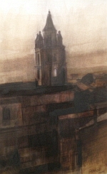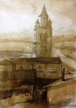 Torre de la catedral desde El Sequeral. Técnica mixta sobre papel, 30 x 21 cm. Francisco Javier Garrido Romanos.