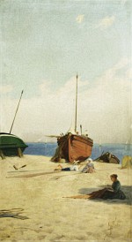 Pescadoras en la playa. 120 x 66 cm. Félix Mestres y Borrel